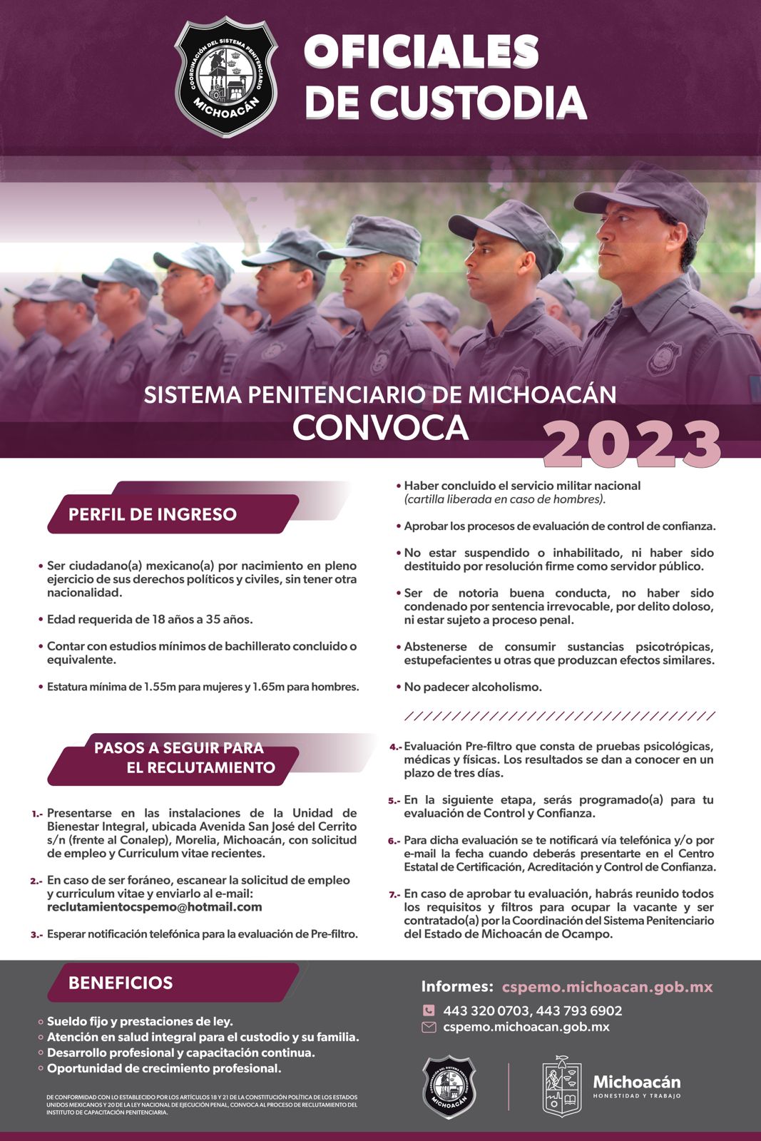 Morelia, Michoacán, 13 de enero del 2023.- En el marco de la convocatoria de reclutamiento 2023, la Coordinación del sistema Penitenciario reforzó la solicitud de personal penitenciario para los municipios de Morelia y Sahuayo.
