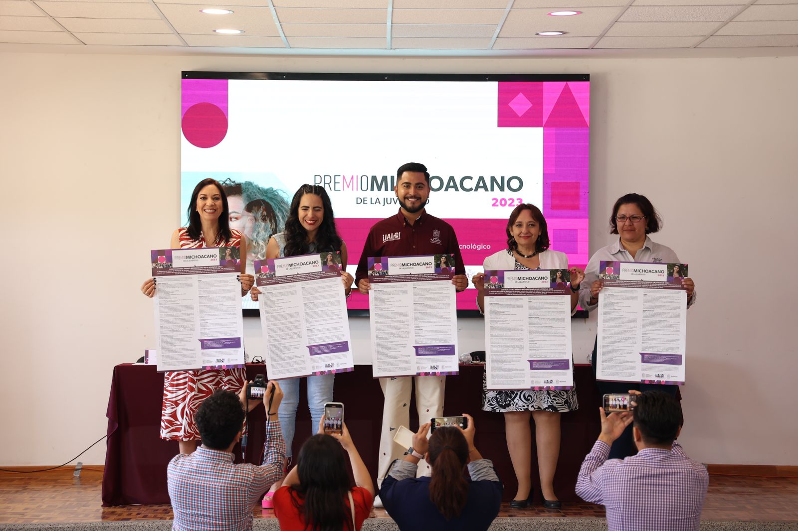 Asistieron al anuncio de la convocatoria Graciela Carmina Andrade García Peláez, rectora de la Universidad Tecnológica de Morelia; Giulianna Bugarini Torres, secretaria de Bienestar; Mariana Sosa Olmeda, directora general del Instituto de Educación Media Superior y Superior; y María Antonieta Paniagua Enríquez, delegada Sindical del Instituto de la Juventud Michoacana.
