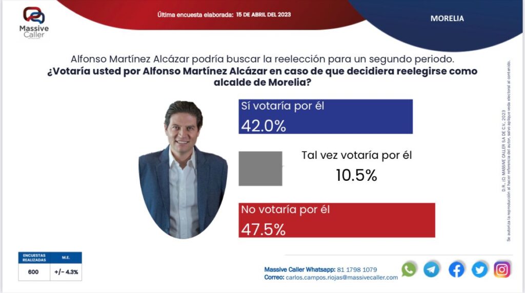 Morelia, Michoacán a 18 de abríl de 2023.- Si hoy fueran las elecciones, el alcalde Alfonso Martínez Alcázar, perdería la reelección en Morelia, según la ultima encuesta de Massive Caller del 15 de abril de este año.