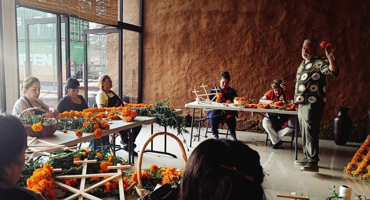 Los asistentes son guiados paso a paso para la elaboración de estos tradicionales arcos que se encuentran en los panteones el 1 y 2 de noviembre, realizados para recibir a los que se adelantaron en el camino.