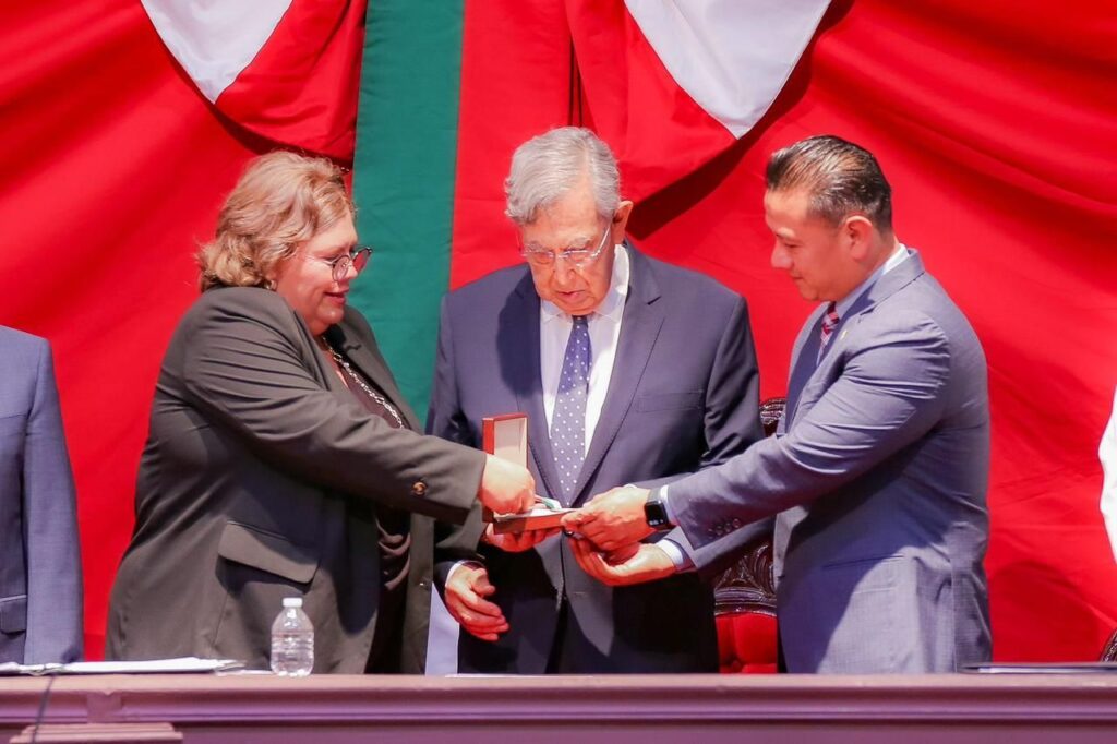 En el evento, desarrollado en Zitácuaro con motivo del 212 Aniversario de la Instalación de la Suprema Junta Nacional Americana, el encargado de la política interna y los representantes de los poderes Legislativo y Judicial, dieron el reconocimiento al exgobernador michoacano y luchador social.