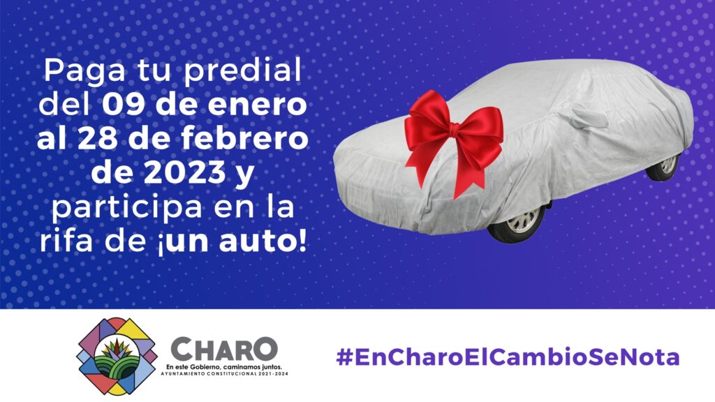 Charo, Michoacán; 16 de enero de 2023.- Por primera vez en la historia del municipio, las y los charenses que paguen su predial hasta el 28 de febrero del año en curso, participarán en una rifa en la que podrán ganar un automóvil último modelo.