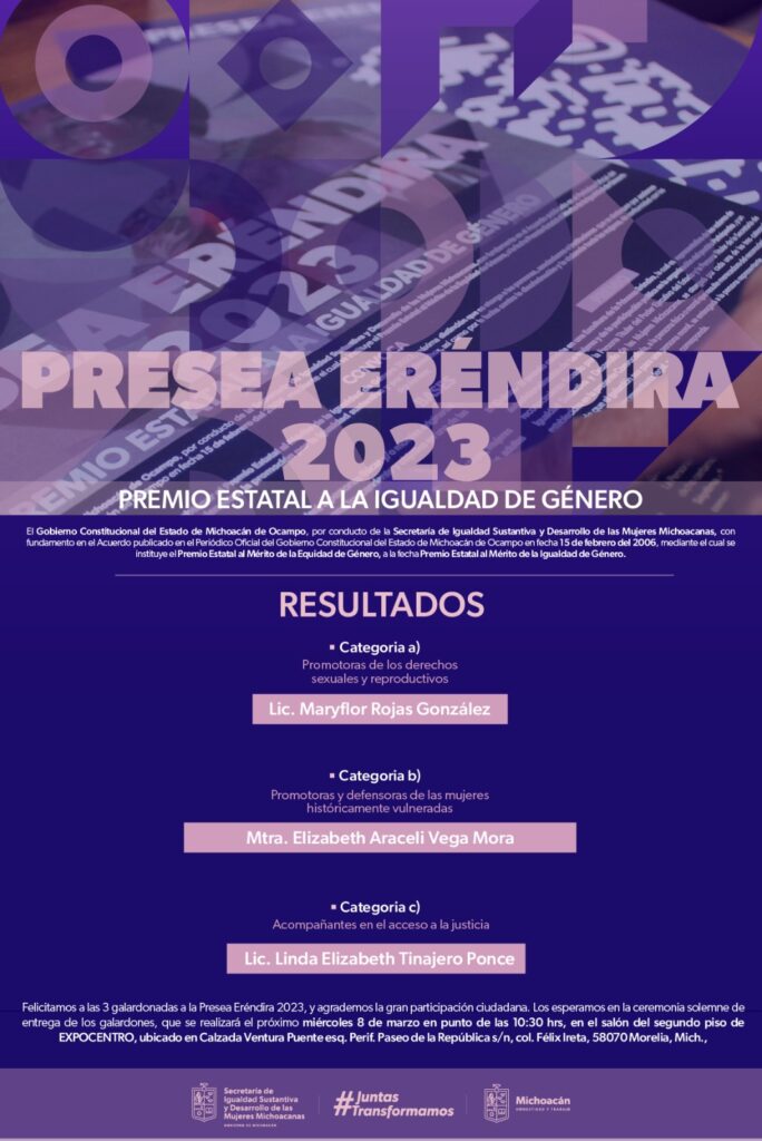Tras recordar que en Michoacán #SomosTodas, Rangel Gracida anunció que será el próximo miércoles 8 de marzo en el Centro de Convenciones y Exposiciones de Morelia (Ceconexpo) cuando se otorguen los tres galardones en ceremonia solemne.