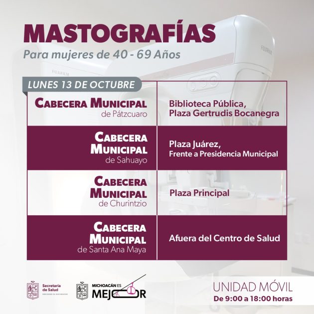 Los convoyes otorgarán atención gratuita a mujeres de 40 a 69 años, de 9:00 a 18:00 horas, en espacios como bibliotecas, plazas públicas, centros de salud y jardines de Sahuayo, Pátzcuaro, Churintzio, Santa Ana Maya, Zináparo, Indaparapeo, Lagunillas, Tarímbaro, Jungapeo, La Piedad, Morelia y Zitácuaro.