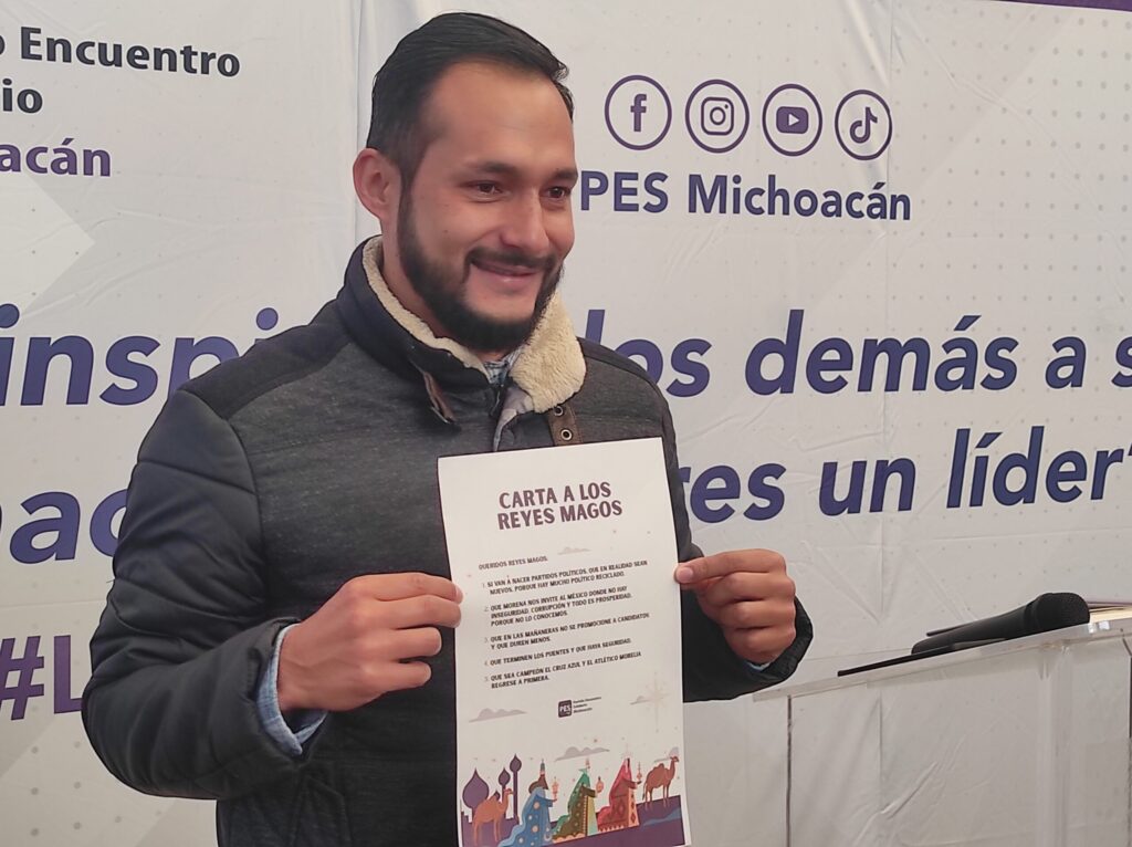 Eder López presidente del comité del PES en Michoacán, exhortó al Gobernador a ser atrevido con las decisiones que toma día a día en el estado para garantizar la seguridad y gobernabilidad para la población, habló de las cifras oficiales de la gente abatida por el crímen organizado, la población sospechosa armada, conviviendo en las mismas calles que la guardia civil, los militares y policía federal o municipal, mencionó la importancia del conocimiento del gobernador de los hechos y la puntual petición de gobernabilidad en el estado, seguridad para todos, garantías de estabilidad, en la misma presentación López García leyó su carta a Reyes Magos una carta llena de buenos deseos y esperanza para la nación, que más menos enumerado dice así.
