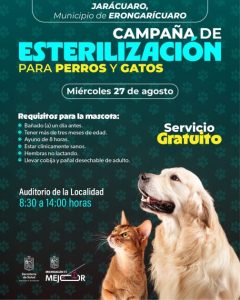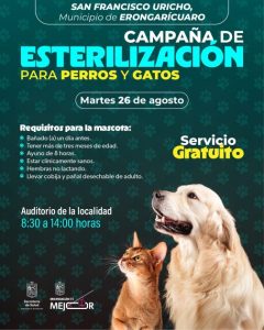 Morelia, Michoacán, 7 de agosto de 2025.- La Secretaría de Salud de Michoacán (SSM) llevará a cabo jornadas de esterilización gratuitas para perros y gatos durante todo el mes de agosto, en siete municipios de la entidad.