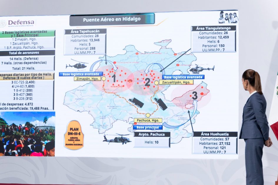 El secretario de la Defensa Nacional, general Ricardo Trevilla Trejo, informó que por instrucciones de la Jefa del Ejecutivo Federal se trasladó a Hidalgo para supervisar la instalación de los tres Centros de Mando: una Base Principal que cuenta con 10 helicópteros en apoyo a 57 comunidades y dos Bases Logísticas Avanzadas, la ubicada en Zimapán cuenta con cinco helicópteros para abastecer a 28 comunidades, mientras que la base en Zacualtipán, dispone de seis helicópteros para 26 comunidades.