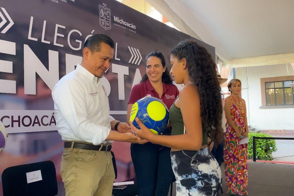 Torres Piña durante el evento encabezó la entrega de sillas de ruedas, apoyos a familias cuidadoras de niñas, niños y mujeres con cáncer, entre otros que formaron parte de la feria realizada en el corazón de la Tierra Caliente.