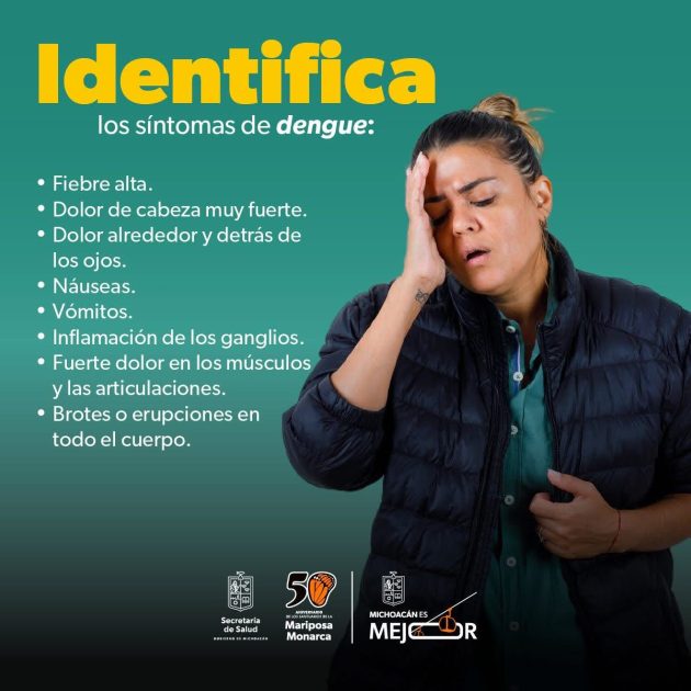 Morelia, Michoacán, 26 de julio de 2025.- La Secretaría de Salud de Michoacán (SSM) reitera a la población la importancia de estar alerta ante síntomas del dengue, tales como fiebre; dolor intenso de cabeza, huesos o detrás de los ojos; náuseas y debilidad.