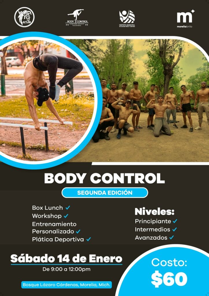 Morelia, Michoacán; 2 de enero 2023.- El Instituto Municipal de Cultura Física y Deporte (Imcufide), convoca a participar en la segunda edición del “Body Control Overcome Gravity 2023”, que tendrá verificativo el sábado 14 del presente mes en el acceso principal del Bosque Lázaro Cárdenas.