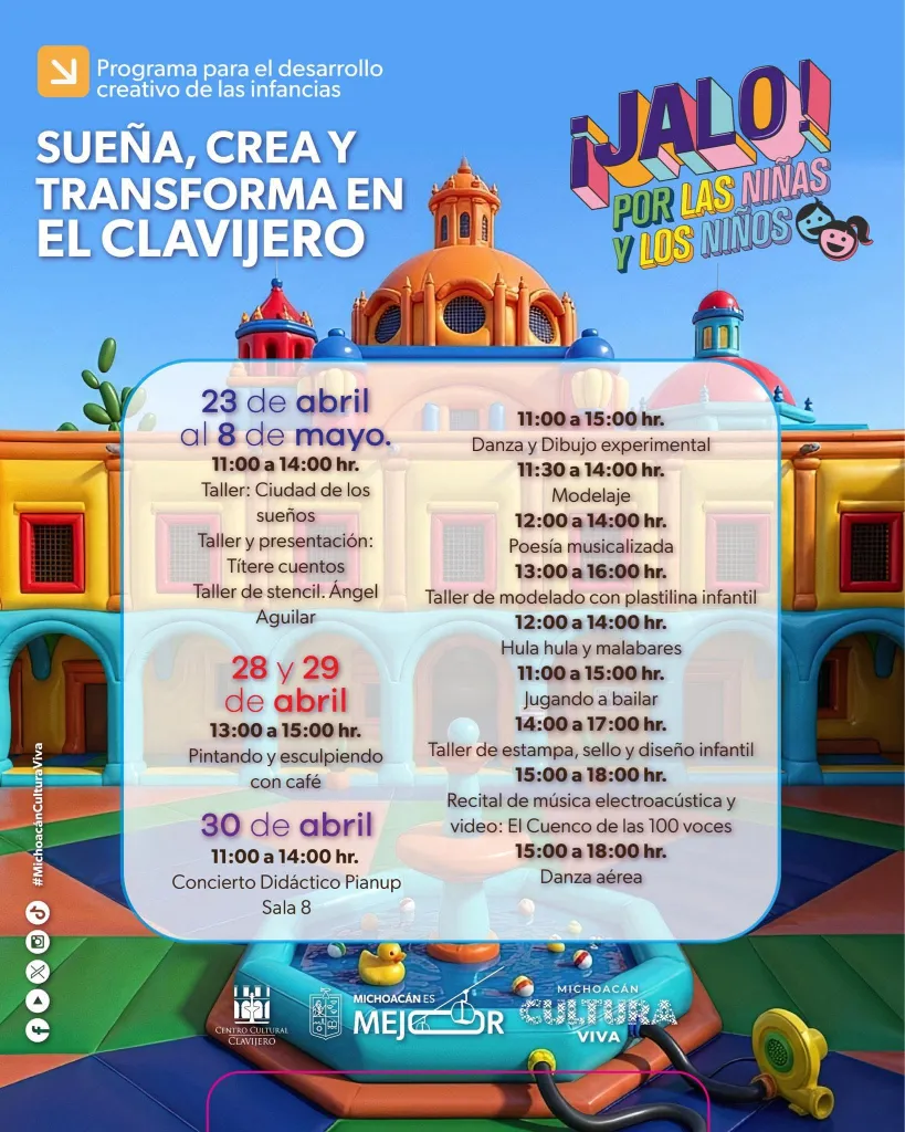 Los niños fueron los protagonistas de la Ciudad de Sueños que se llenó de vida este jueves en el Centro Cultural Clavijero como parte de las actividades encomendadas por la Secretaría de Cultura de Michoacán para promover la creatividad en los infantes a través de actividades artísticas.
