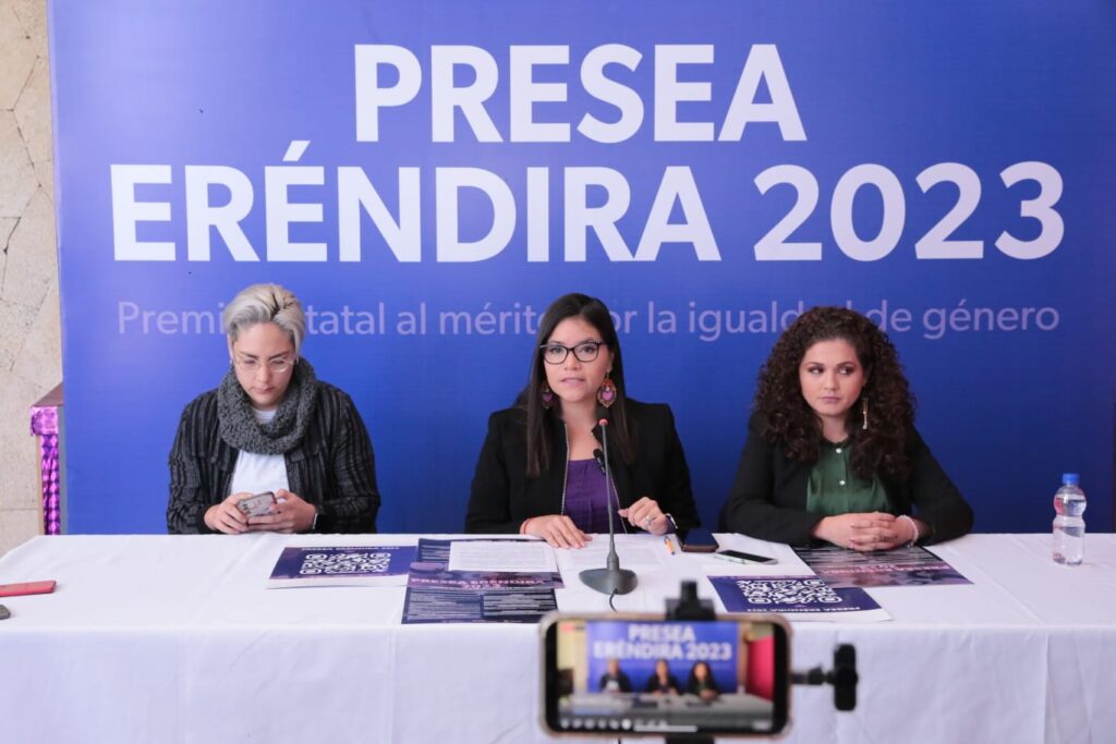 Morelia, Michoacán, 14 de febrero del 2023.- -El Gobierno de Estado, a través de la Secretaría de Igualdad Sustantiva y Desarrollo de las Mujeres Michoacanas (Seimujer), lanzó la convocatoria para la entrega de la Presea Eréndira 2023, máxima distinción que se otorga a personas, asociaciones e instituciones que se destaquen por acciones sobresalientes o compromiso social en la búsqueda del bienestar, la promoción por la igualdad y la lucha contra la discriminación y violencia hacia las mujeres.