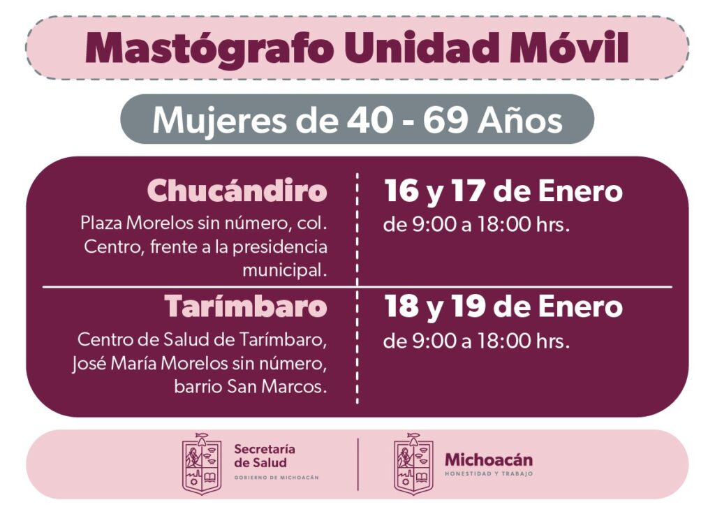En Chucándiro los estudios se efectuarán del 16 al 17 de enero, pues una unidad móvil se instalará en la plaza Morelos, ubicada frente a la presidencia municipal, desde las 09:00 hasta las 18:00 horas. Las citas se pueden agendar en la línea telefónica 4433065604 o en las instalaciones de la alcaldía.