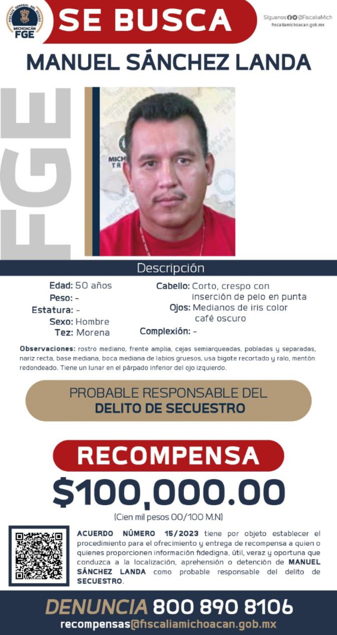 En atención a ello, y de conformidad con las atribuciones que le confiere la Ley Orgánica de la Fiscalía General del Estado de Michoacán para el Ofrecimiento y Entrega de Recompensas, el Fiscal General Adrián López Solís, firmó el acuerdo 15/2023 de ofrecimiento y entrega de recompensa para la localización y detención Manuel Sánchez Landa.