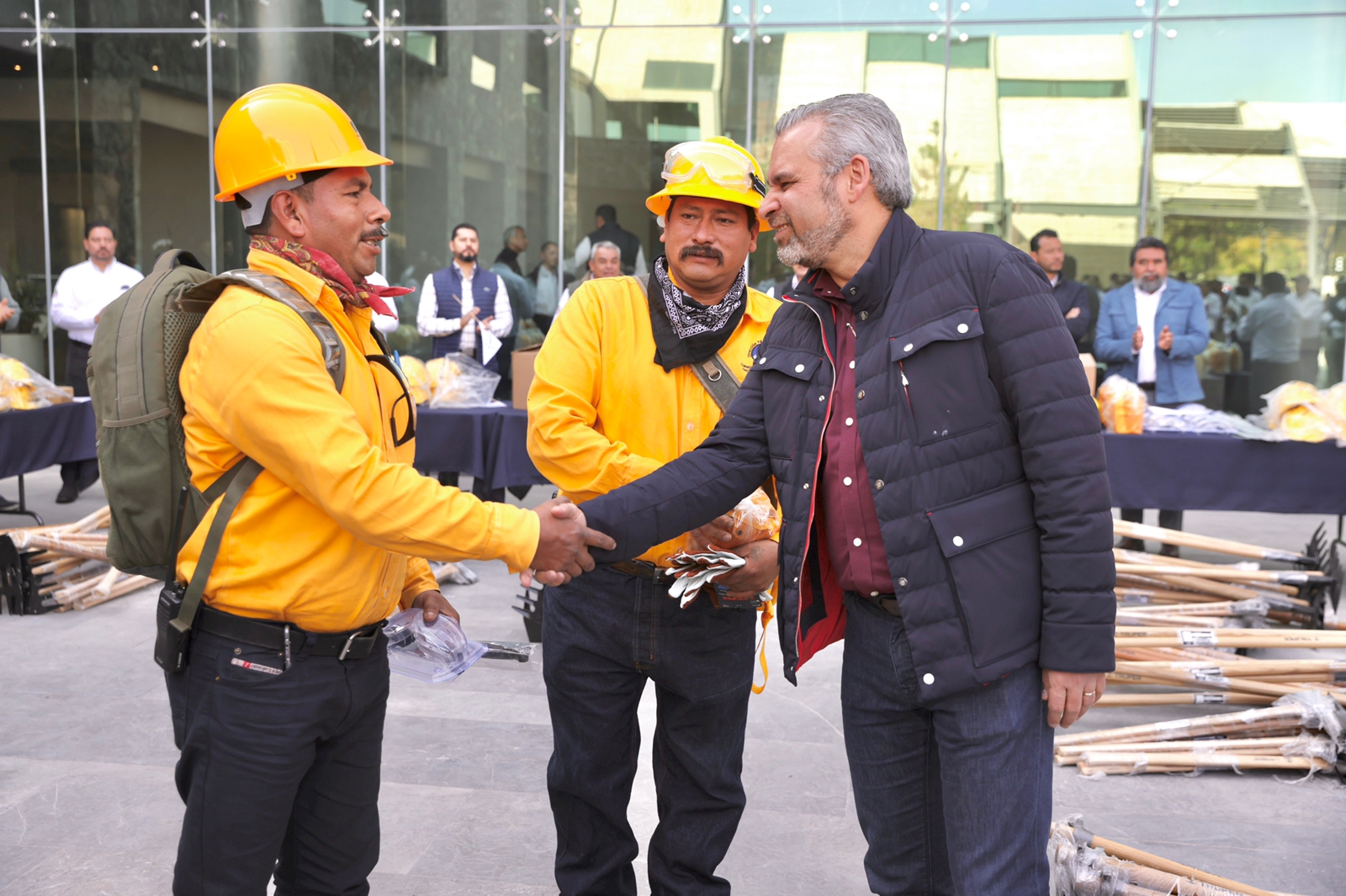 Uruapan, Michoacán, 17 de enero del 2023.- El gobernador Alfredo Ramírez Bedolla participó en la entrega de equipo que realizaron directivos de la Asociación de Productores y Empacadores Exportadores de Aguacate de México (APEAM), a 46 brigadas que combaten los incendios, tanto en huertas de aguacate como en zonas forestales de la región.
