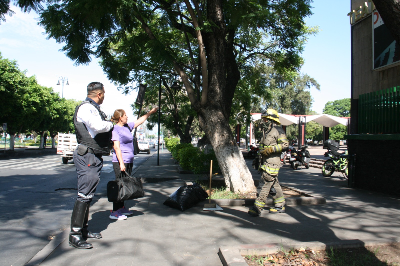 Morelia, Michoacán; 20 de julio del 2023.- En una acción rápida, elementos de la Coordinación Municipal de Protección Civil y Bomberos en coordinación con la Policía Morelia atienden el reporte de picaduras de abejas en la explanada del Instituto Mexicano del Seguro Social (IMSS), ubicado sobre la avenida Madero Poniente.