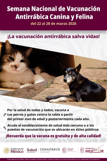 Morelia, Michoacán, 24 de marzo de 2026.- La Secretaría de Salud de Michoacán (SSM) mantiene activa la Semana Nacional de Vacunación Antirrábica Canina y Felina 2026, la cual se desarrollará hasta el 28 de marzo. Con el propósito de salvaguardar la salud pública, la dependencia invita a la población a seguir llevando a sus animales de compañía a los puestos de vacunación.