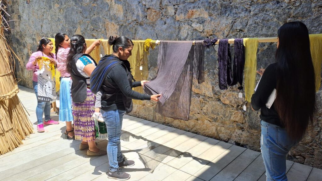 *Uruapan, Michoacán, 23 de junio de 2023.-* Cuatro artesanas de diversas localidades del estado, participan en el diplomado Laboratorio de tintes naturales: textiles de algodón, seda y lana, con el objetivo de experimentar y dominar las diferentes técnicas de teñido de hilo para los colores rojos, azules, amarillos, negro y sus derivados.