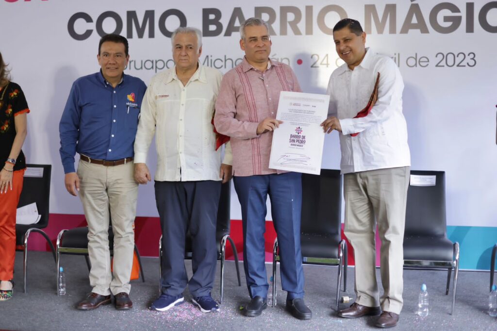 *Uruapan, Michoacán, 24 de abril de 2023.-* El gobernador Alfredo Ramírez Bedolla y el secretario de Turismo, Miguel Torruco Marqués, entregaron a San Pedro, del municipio de Uruapan, el primer nombramiento “Barrio Mágico” de Michoacán, otorgado a destinos emblemáticos del país.