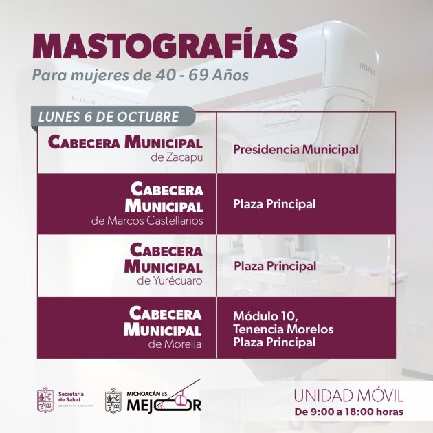 Del 6 al 10 de octubre, estas unidades recorrerán Zacapu, Marcos Castellanos, Yurécuaro, Morelia, Quiroga, Cuitzeo, Tzintzuntzan, Cojumatlán, Tlazazalca, Huiramba, Sahuayo, Zinapécuaro, Lagunillas y Churintzio para brindar atención gratuita a mujeres de 40 a 69 años, quienes por cuestiones geográficas se les dificulta el traslado a las centros médicos fijos.