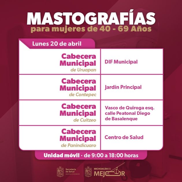 Morelia, Michoacán, 19 de abril de 2026.- La Secretaría de Salud de Michoacán (SSM) desplegará unidades móviles de mastografía en nueve municipios de la entidad, del 20 al 24 de abril, para acercar la detección oportuna del cáncer de mama a mujeres de entre 40 y 69 años.
